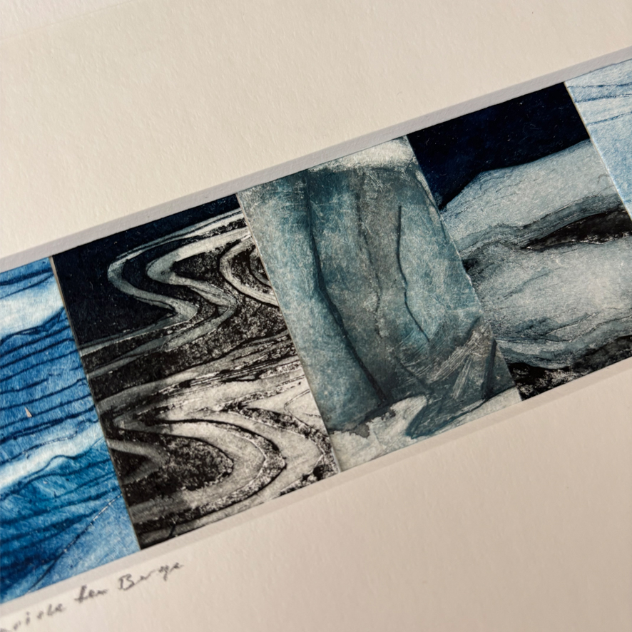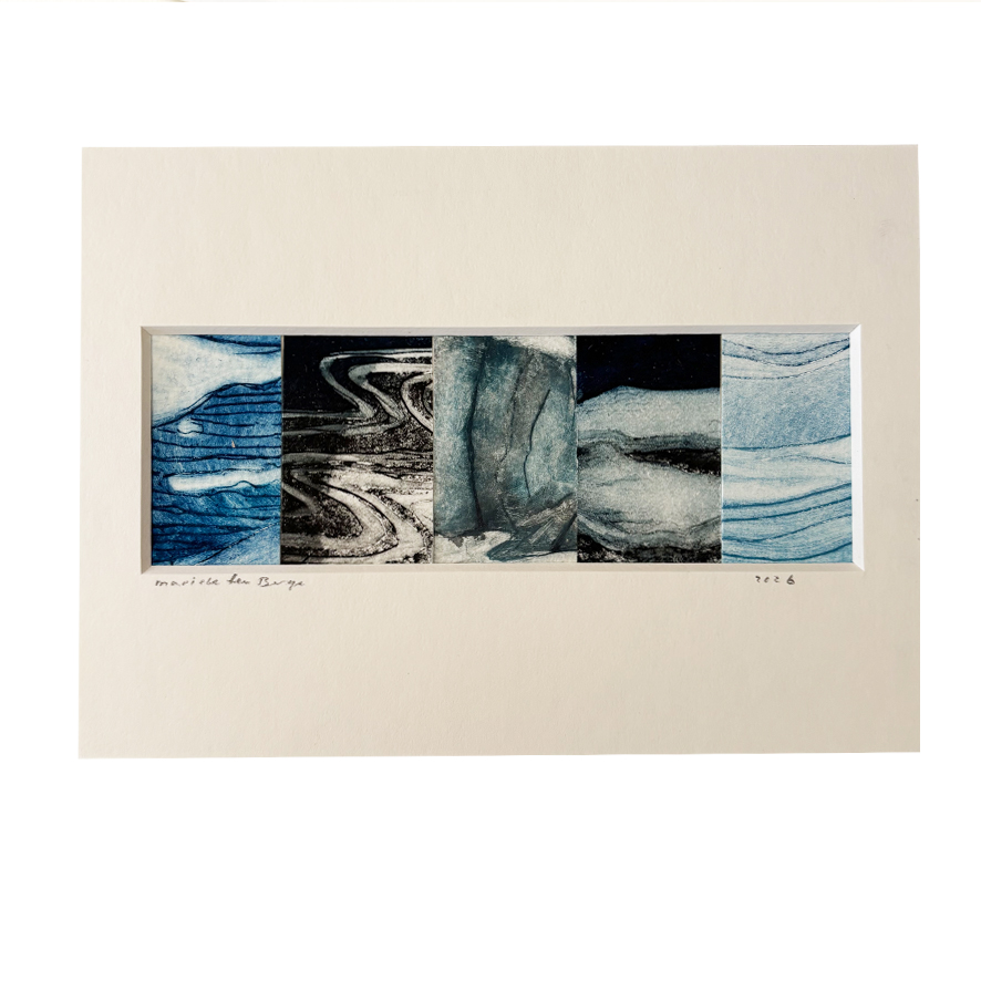 Een collage van elementen uit mijn ijs etsen. De afbeelding is 5/15cm. De passe-partout heeft een standaard maat van 13/18cm. Ze zijn allemaal uniek.