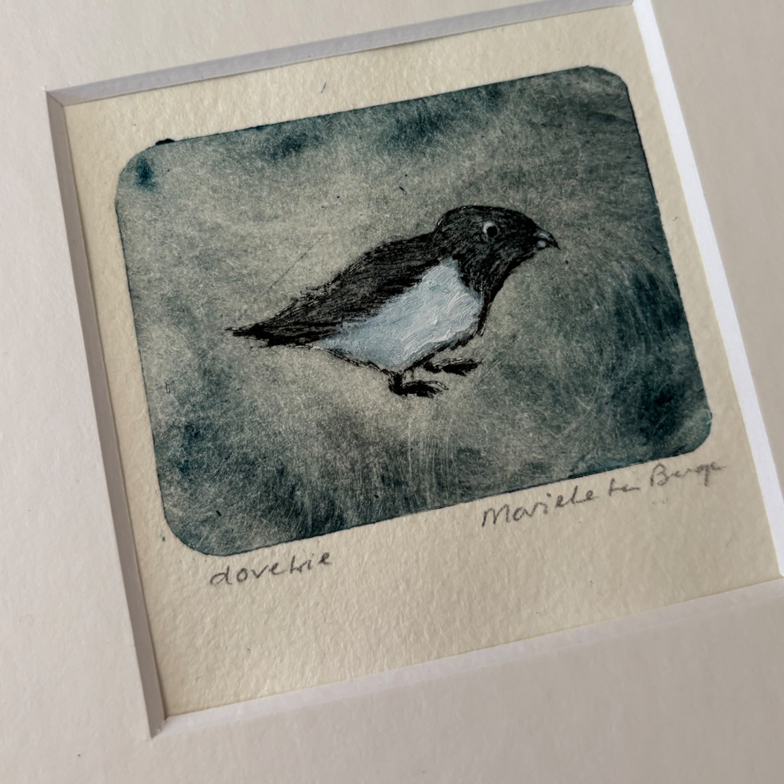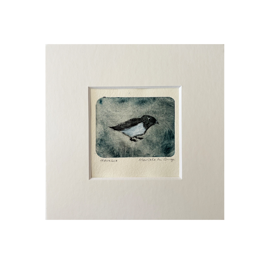 Etsje van een kleine alk, de afbeelding is 5/6,5 cm en de passe partout heeft een standaard maat van 15/15cm waardoor je hem makkelijk in een lijstje kunt doen.