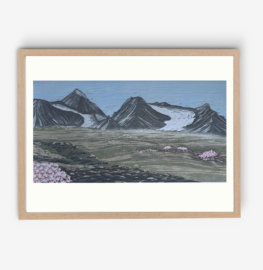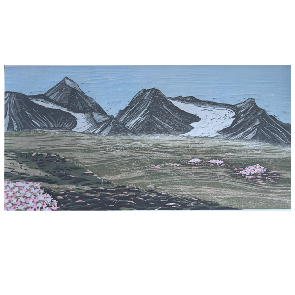 Reductie houtprint van Eidembukta in het zomerlicht.