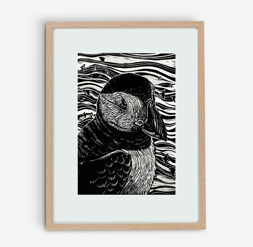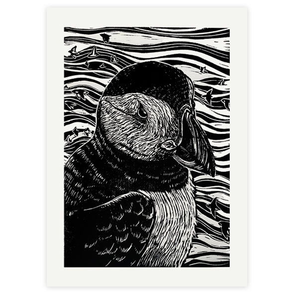 Lino print van een papegaaiduiker. In zwart afgedrukt in beperkte oplage. De print zelf in A4 met eromheen genoeg wit papier om hem in te lijsten.