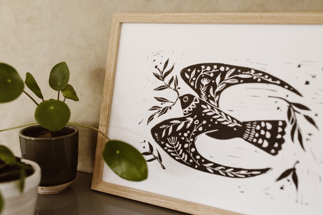 A4 originele linoprint met gouden stipjes. Inclusief lijst