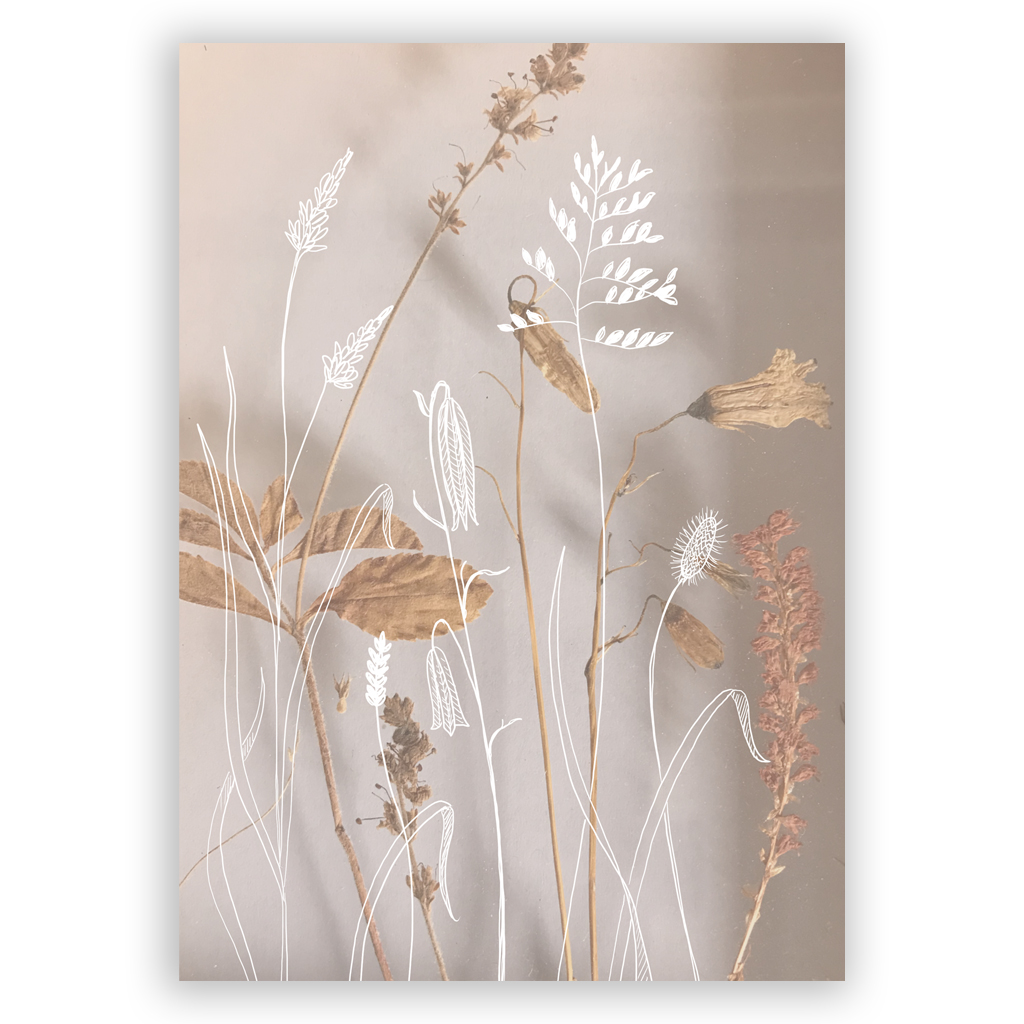 Foto van gedroogde bloemen met daar over heen lijntekeningen van veldbloemen. Gedrukt op Tintoretto