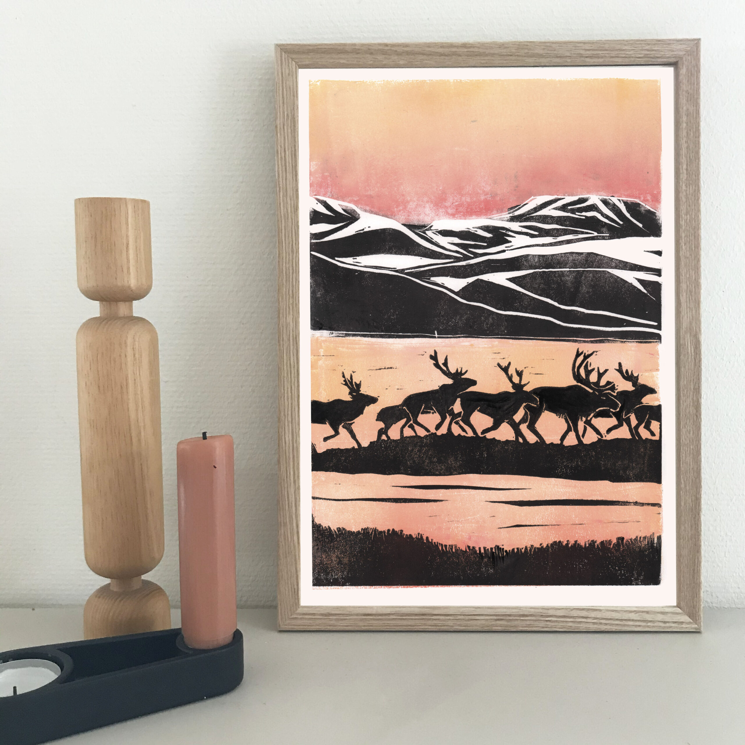 Mooie art print van rendieren in Zweeds Lapland. Illustratie uit het boek Noord, gedrukt op luxe papiersoort op A4 formaat.